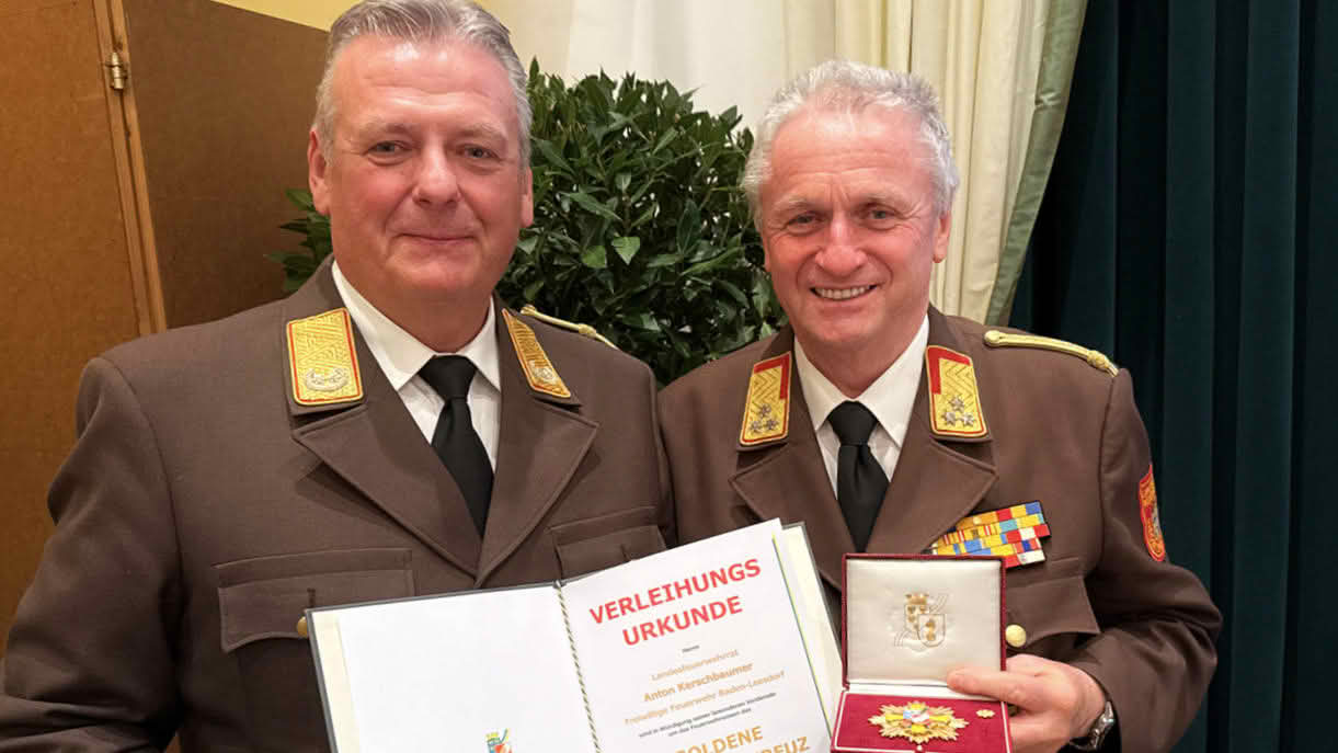 Als einer der ersten Gratulanten waren Landesfeuerwehrkommandant Dietmar Farafellner sowie der scheidende Bezirksfeuerwehrkommandant Landesfeuerwehrrat Anton Kerschbaumer, welcher 17 Jahre die Führung innehatte und altersbedingt nicht mehr in dieser Funktion zur Verfügung stand. In Würdigung seiner jahrelangen Bemühungen und Verdienste für den Feuerwehrbezirk BADEN, aber auch als Viertelkommandant des NÖ Landesfeuerwehrverbandes erhielt „Toni“ Kerschbaumer von unserem Landesfeuerwehrkommandant das goldene Verdienstkreuz.