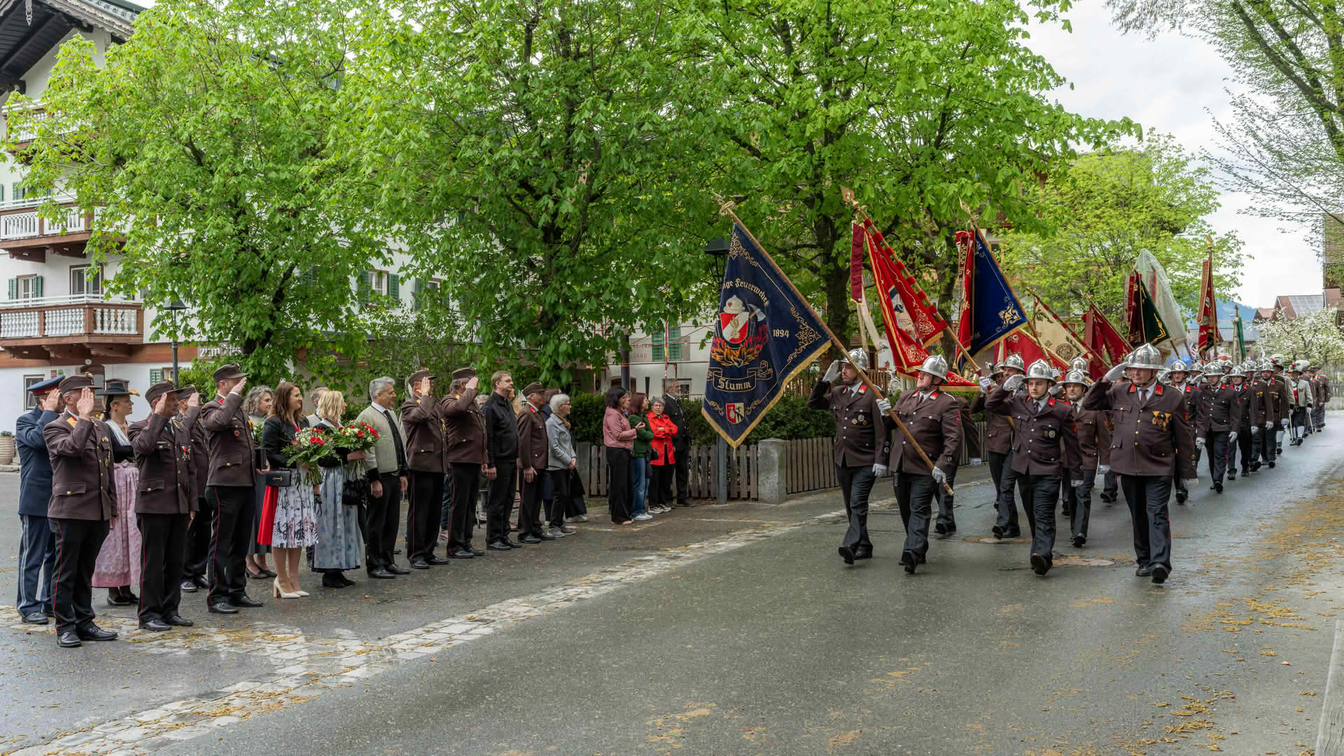 Den feierlichen Abschluss bildete die Defilierung am Stummer Dorfplatz. Danach klang die Veranstaltung bei einer gemeinsamen Verköstigung im Gasthof Pinzger in kameradschaftlicher Atmosphäre aus.