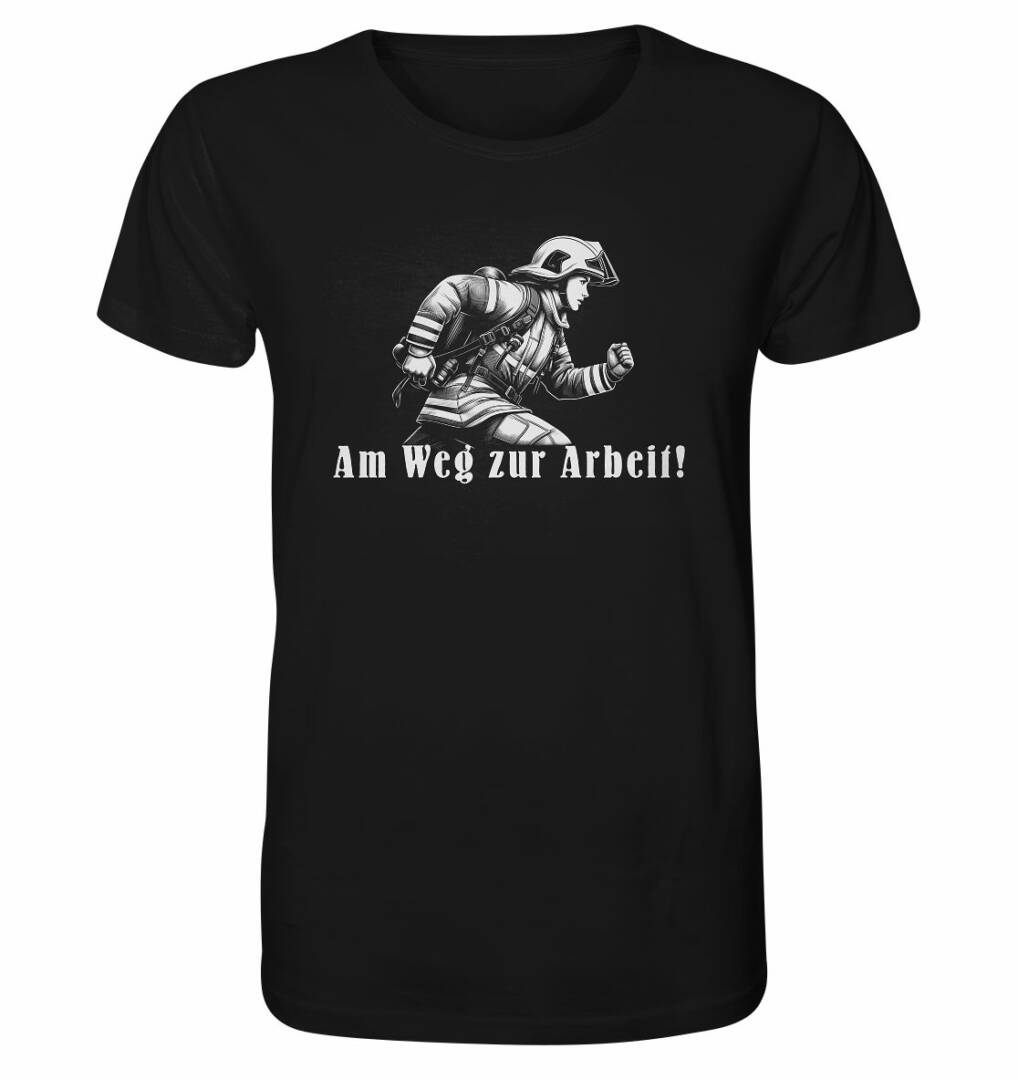 - Schwarzes T-Shirt mit weißer Strichzeichnung einer Feuerwehrfrau